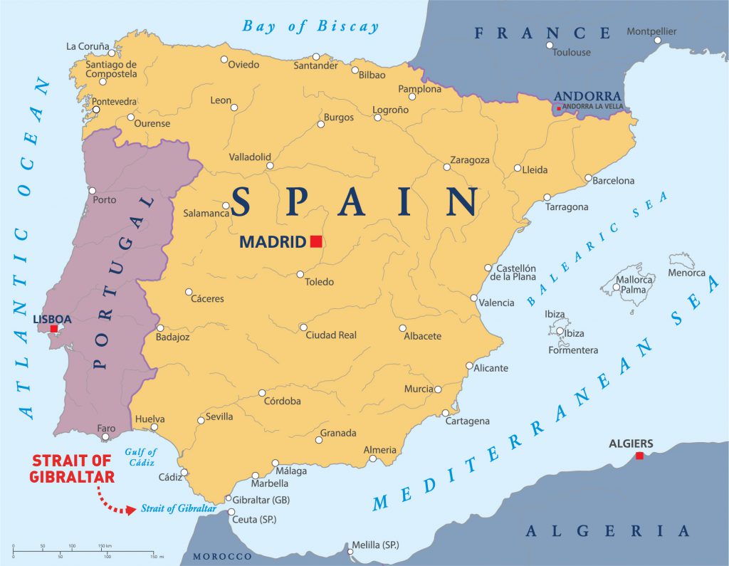 - The Strait of Gibraltar separates the Atlantic Ocean from the Mediterranean Sea