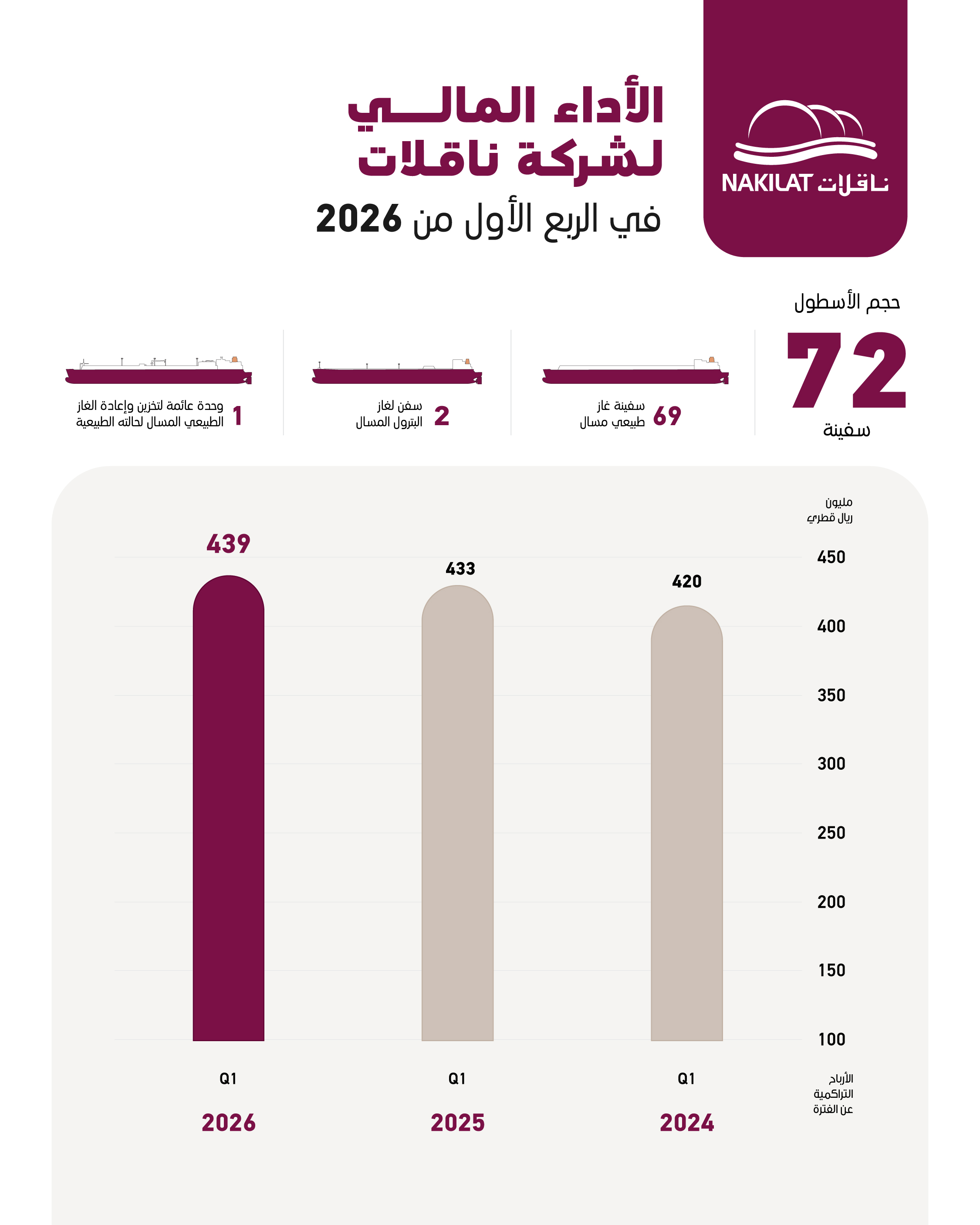 الدوحة، قطر – 21 أبريل 2026: أعلنت شركة قطر لنقل الغاز المحدودة (ناقلات) ش.م.ع.ق عن نتائجها المالية للربع الأول المنتهي في 31 مارس 2026. حيث حققت الشركة صافي ربح قدره 439 مليون ريال قطري، مقارنة بصافي ربح قدره 433 مليون ريال قطري عن الفترة نفسها من العام 2025.